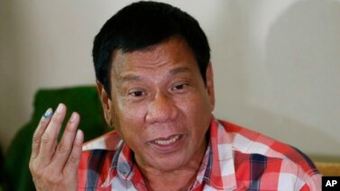 Front-running presidential candidate Mayor Rodrigo Duterte gestures during his second news conference after voting in a polling precinct at Daniel R. Aguinaldo National High School, Matina district, his hometown in Davao city in southern Philippines, May